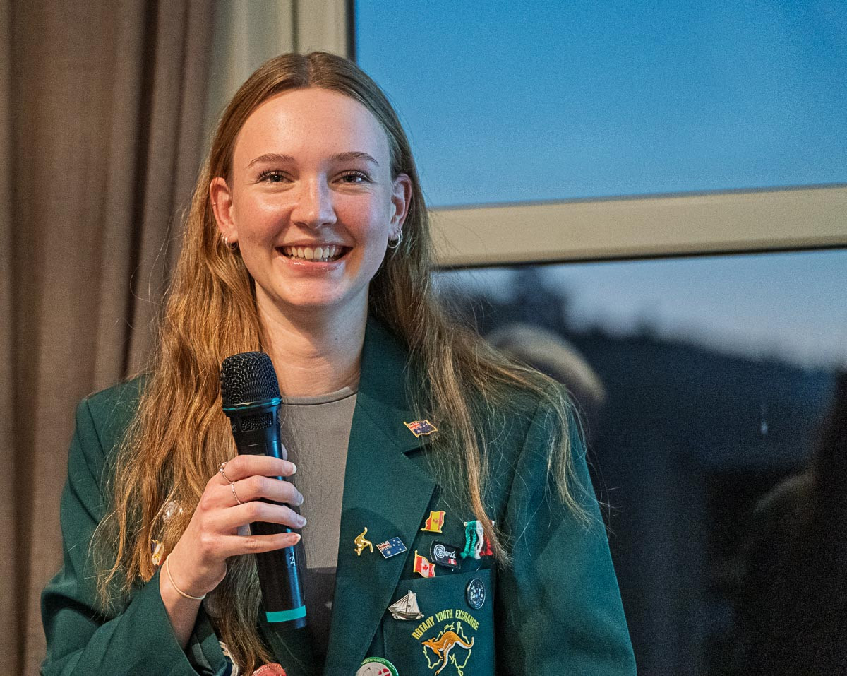 Asha Casey, for anledningen iført Rotary Youth Exchange-jakke, fortalte om sin tid som Rotary-utvekslingsungdom på Nesbru og Kolsås.